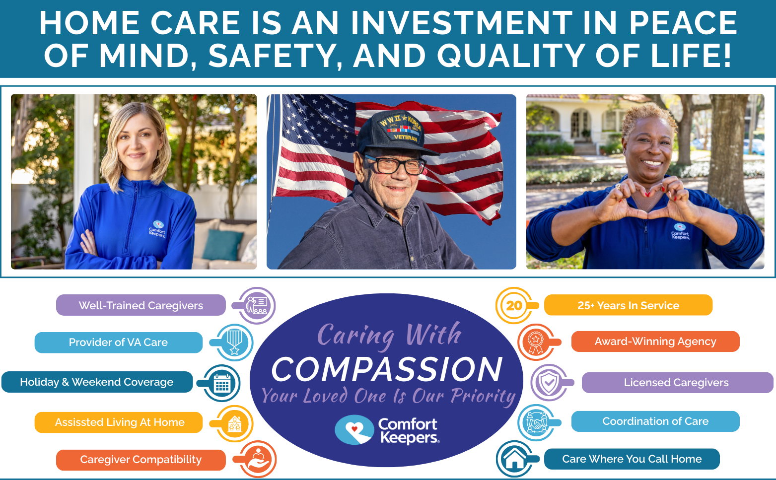 At Comfort Keepers of Upland, we proudly honor and support local veterans with specialized in-home care. From personal care and companionship to help with mobility, meals, and VA benefit coordination, our caregivers provide the respect and assistance our heroes deserve.