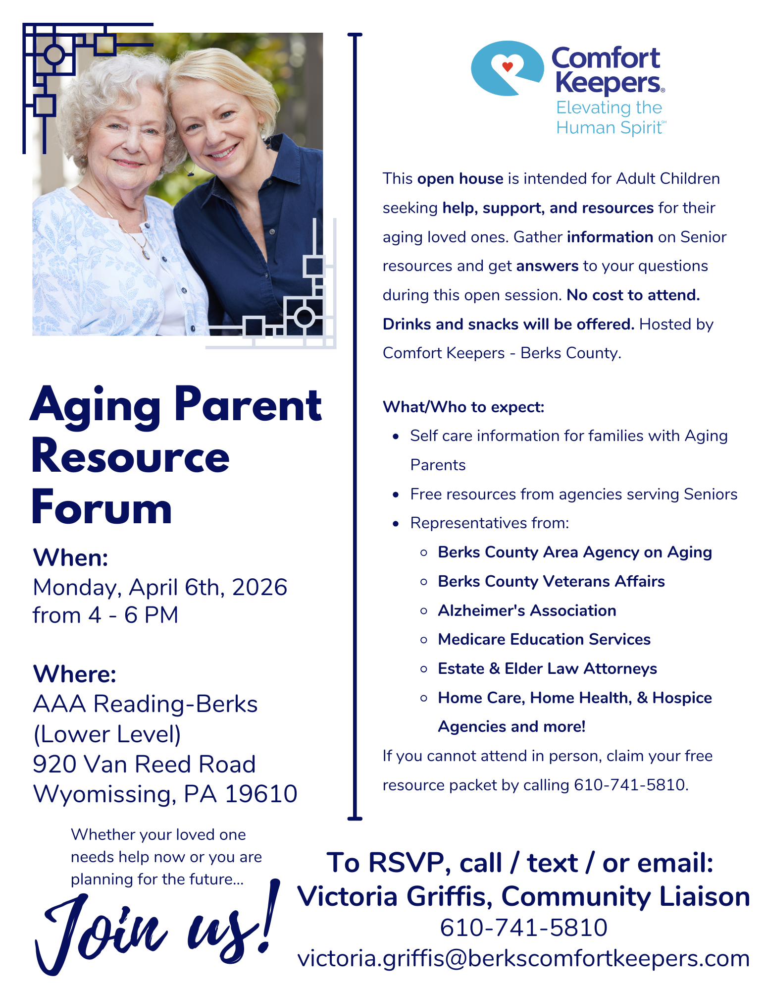 To RSVP, please call, text, or email: Victoria Griffis, Community Liaison.